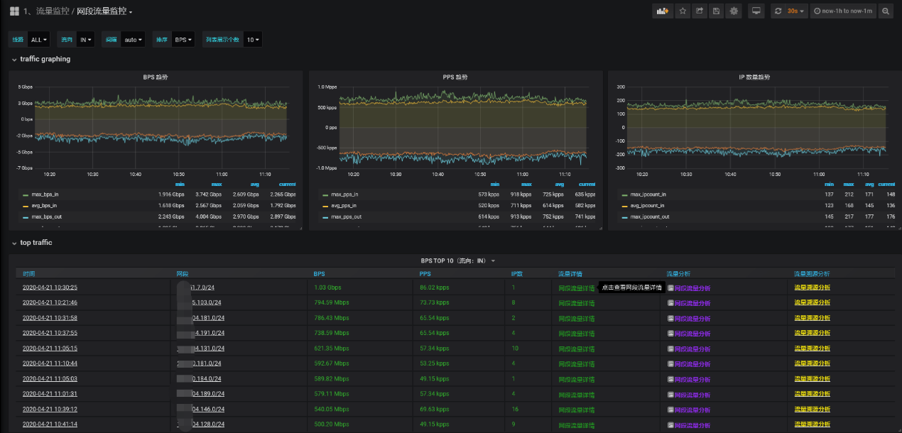 可对全网的网络流量,按照网段、IP等视角,根据上下行BPS/PPS等维度,进行分析、统计及趋势预测;可精确定位网络资源占用最高的网段、IP以及业务所发生的时点;可对任意IP、任意时点的流量情况进行分析及溯源。