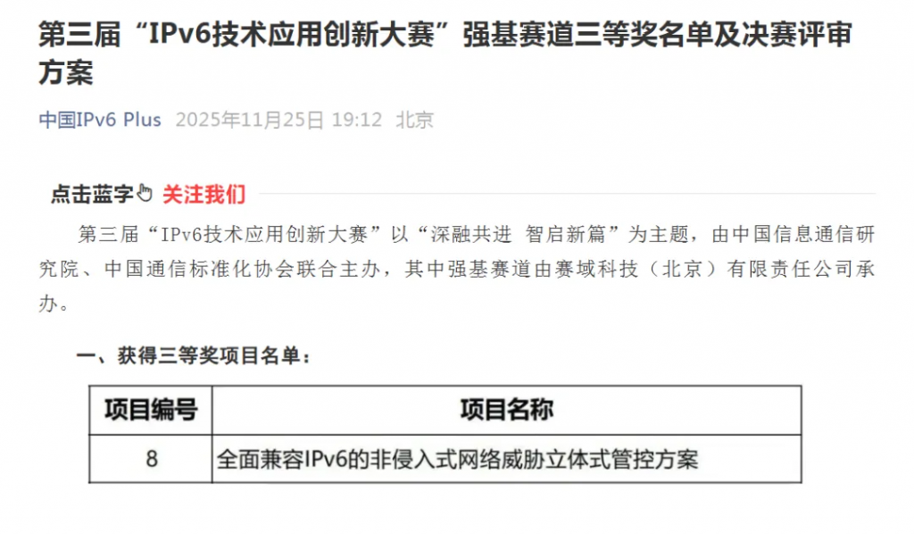福建雷盾信息安全有限公司携手同济大学、福建省工业信息产业发展研究中心与中国联合网络通信有限公司福建省分公司,共同申报的“全面支持IPV6的非侵入式网络威胁立体式管控方案”,在权威的第三届“IPV6技术应用创新大赛”中斩获强基赛道三等奖!这一荣誉不仅彰显了雷盾信安在下一代互联网安全领域的领先实力,更标志着产学研用协同创新模式在网络安全领域的成功实践!
